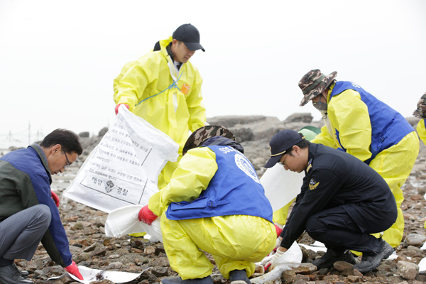 인천해양경찰서가 29일 인천시, 자원봉사자 등 22개 기관, 단·업체 100여 명이 참여한 가운데 ‘민·관 합동 해안방제훈련’을 실시하고 있다. 이번 훈련은 유조선 충돌로 기름이 영종도 선녀바위 해안으로 밀려와 해안가 약 200m가 오염된 상황을 가정해 실시됐다. /인천해경 제공