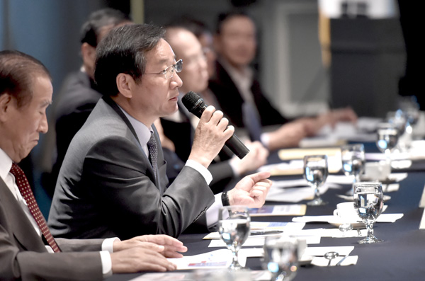 유정복 인천시장이 1일 서울 여의도 렉싱턴호텔 15층에서 열린 ‘㈔인천항발전협의회 주관 인천국회의원 초청 조찬간담회’에서 인천항 발전과 관련해 상호협력을 강조하고 있다. /인천시 제공