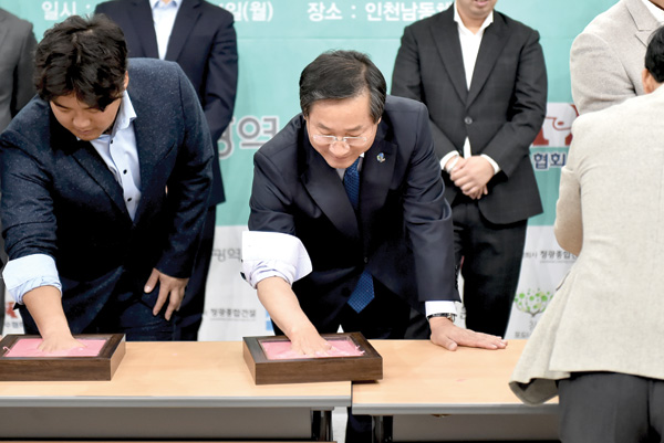 유정복 인천시장이 6일 시청 중앙 로비에서 ‘선수협회관계자 및 유소년 야구클리닉 지원관계자’와 함께 홍보 기념촬영 및 핸드프린팅과 사인을 하고 있다. /인천시 제공