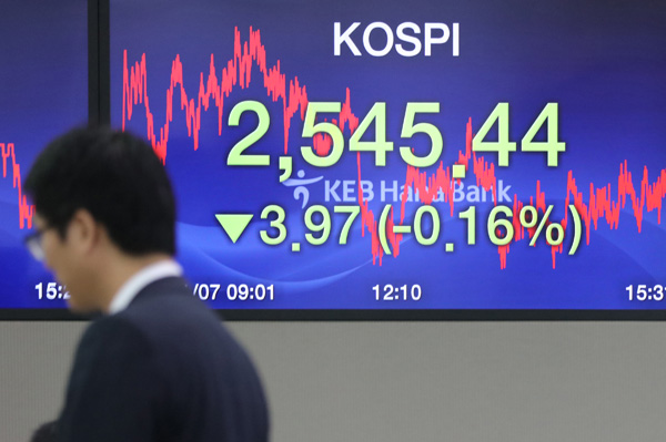 7일 코스피는 전날보다 3.97p(0.16%) 내린 2,545.44로 장을 마쳤다. 원/달러 환율은 3.1원 내린 1,111.9원으로 마감됐다. 사진은 이날 을지로 KEB하나은행 본점 딜링룸 모습. /연합뉴스