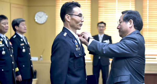 유정복 인천시장이 10일 시청 접견실에서 신설 송도소방서 관서장 및 승진자와 장기 근무한 관서장과 공로연수 관서장에게 ‘소방공무원(지방소방정)임용장’을 수여하고 있다. /인천시 제공