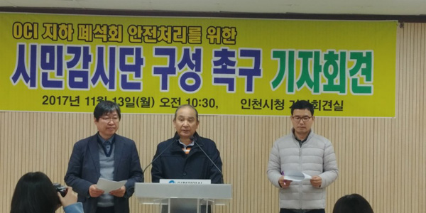 인천평화복지연대 등 인천시민단체가 13일 시청 브리핑룸에서 기자회견을 열고 아직까지 남아있는 OCI 폐석회의 안전한 처리를 위해 시민감시단 구성을 촉구하고 있다. /인천시민단체 제공