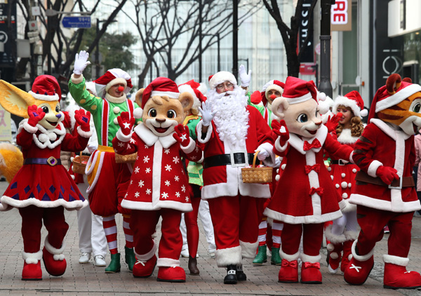 13일 에버랜드 대표 캐릭터와 산타가 서울 중구 명동에서 ‘에버랜드, 도심에서 미리 만나는 크리스마스’ 공연을 펼치고 있다. /연합뉴스
