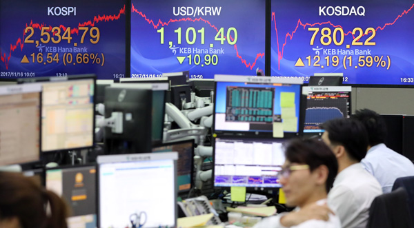 16일 서울 명동 KEB하나은행 본점에서 직원들이 업무를 보고 있다. 이날 원/달러 환율 종가는 전일보다 10.9원 하락한 달러당 1,101.4원으로 코스닥은 12.19포인트 오른 780.22로 코스피는 2,534.79 포인트로 마감했다./연합뉴스