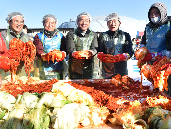 유정복 인천시장이 18일 문학경기장 동문광장에서 열린 ‘애인(愛仁) 김장 대축제’에서 소외계층에 전달할 김장을 담그고 있다. /인천시 제공