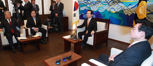 오전 국회 본청 의장 접견실에서 정세균 국회의장과 여야 3당 원내대표가 회동 하고 있다. 왼쪽부터 국민의당 김동철 원내대표, 더불어민주당 우원식 원내대표, 정 의장, 자유한국당 정우택 원내대표.