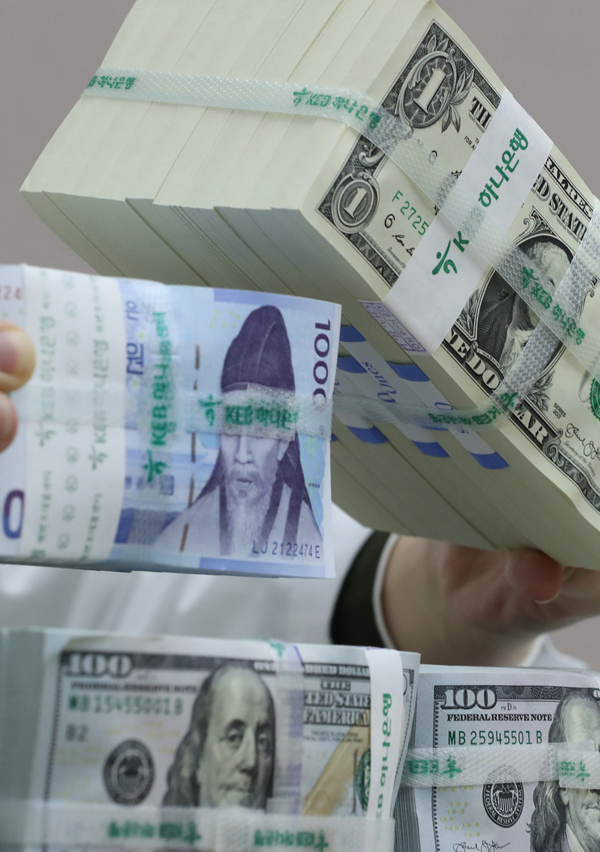 원/달러 환율이 22일 하락세를 지속, 장중 달러당 1,090원이 깨지면서 연중 최저치를 경신했다. 이날 오후 서울 중구 을지로 KEB 하나은행 본점 위변조대응센터에서 한 직원이 원화와 달러화를 살펴보고 있다./연합뉴스