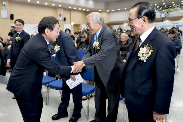 유정복 인천시장이 28일 시청 대회의실에서 열린 ‘제5회 2017 인천 노인일자리 및 사회활동지원사업 통합평가회’에서 김경현 대한노인회 인천광역시연합회 회장을 만나 인사를 나누고 있다. /인천시 제공