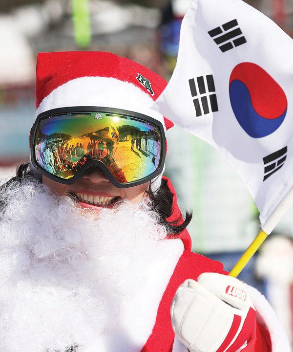 30일 오전 광주시 도척면 곤지암리조트에서 스키시즌 오픈을 기념해 열린 ‘미리 찾아온 산타클로스’ 행사에서 산타 복장을 한 스키어가 파이팅을 외치며 환하게 웃고 있다./연합뉴스