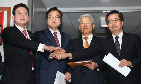 새해 예산안 ‘지각 합의’ 여야 원내대표들, 손은 잡았지만…
