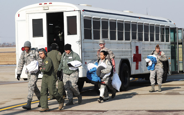6일 오후 평택시 주한미공군 오산기지에서 열린 ‘항공의무후송훈련’에서 부상병들이 C-130 수송기로 이동하고 있다.