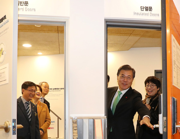 문재인 대통령이 7일 오전 서울 노원구 ‘노원 에너지제로(EZ) 주택 오픈하우스’를 방문해 홍보관 관람을 하며 일반문과 단열문을 비교해 보고 있다./연합뉴스