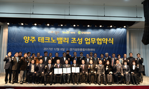 지난 8일 양주 소재 경기섬유종합지원센터에서 (앞줄 왼쪽 7번째부터)이성호 양주시장, 남경필 경기도지사, 김용학 경기도시공사 사장이 ‘양주테크노밸리 조성을 위한 업무협약’을 체결한 후 참석자들과 화이팅을 외치고 있다./경기도 제공