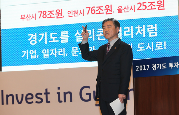 11일 오후 서울 건축회관 2층 대회의실에서 열린 ‘2017 경기도 투자설명회’에서 이재율 경기도 행정1부지사가 경기도 투자 설명을 하고 있다./경기도 제공