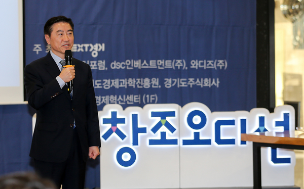 12일 오후 경기창조경제혁신센터 1층에서 열린 ‘2017년 제5회 업(業·UP)창조오디션’에서 이재율 경기도 행정1부지사가 인사말을 하고 있다. 이날 오디션 결과 ‘위키너’가 가상투자상을, ‘핀텔’이 심사위원상을 각각 수상했다. /경기도 제공