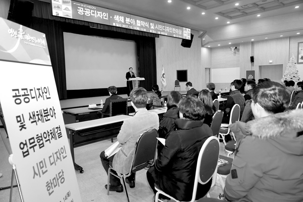 유정복 인천시장이 14일 시청 대회의실에서 열린 ‘인천 공공디자인 업무협약 체결 및 시민 디자인 한마당’ 행사에 참석해 인사말을 하고 있다. /인천시 제공
