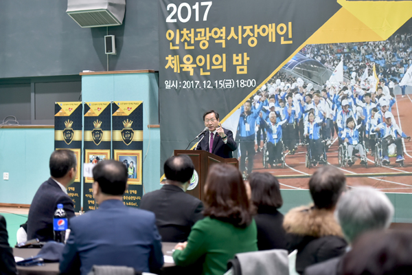 유정복 인천시장이 지난 15일 선학체육관 소재 장애인국민체육센터에서 열린 '2017년 인천 장애인 체육인의 밤'에서 축사를 하고 있다./인천시 제공
