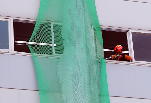 18일 오후 인천 남동구의 한 전자업체에서 인천 공단소방서 대원들이 공장 외벽에 붙은 대형 고드름을 제거하고 있다. 인천 공단소방서는 이 고드름의 길이가 15m가량 되는 것으로 보고 있으며 하수관이 막혀 물이 역류하면서 생긴 것으로 추정했다. /연합뉴스