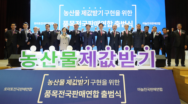 20일 오후 서울 중구 농협중앙회 본관에서 열린 농산물 제값받기 구현을 위한 마늘·토마토 품목전국판매연합 출범식에서 참석자들이 기념촬영을 하고 있다. /연합뉴스