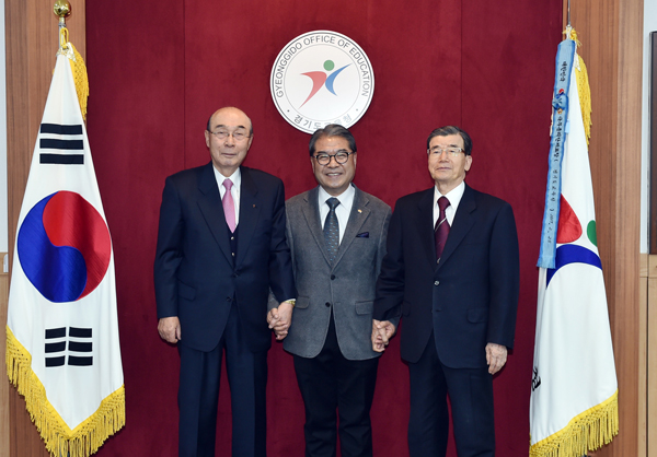 이재정 경기도교육감이 지난 20일 오전 교육감실에서 조성윤(10, 11대), 윤옥기(12대) 전직 교육감과 함께 경기교육의 발전 방향에 대해 다양한 의견을 나눴다. 사진은 간담회 후 기념촬영을 하고 있는 모습. /도교육청 제공