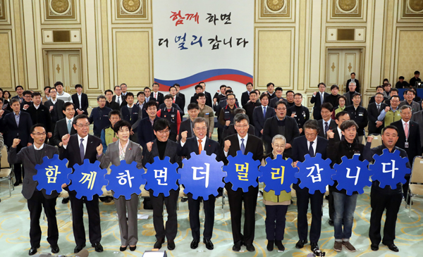 문재인 대통령이 21일 오후 재단법인 공공상생연대기금 관계자와 비정규직 처우개선·일자리 창출에 앞장선 노사대표를 청와대로 초청해 개최한 ‘상생연대실천 노사와의 만남’ 행사에서 ‘함께하면 더 멀리 갑니다’라고 쓴 톱니바퀴 모양의 손팻말을 들고 포즈를 취하고 있다./연합뉴스
