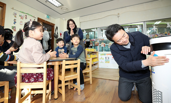 남경필 경기도지사가 27일 오전 안산시 시립 ‘별빛 어린이집’ 을 방문해 어린이집의 실내공기질 실태를 살펴보고 학부모, 보육교직원과의 간담회를 진행했다. 사진은 남 지사가 어린이들에게 현장에 설치된 공기청정기에 대해 설명하고 있는 모습./경기도 제공
