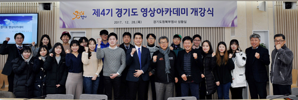 경기도 공유경제 대표 사업 중 하나인 ‘제4기 경기도 영상 아카데미’가 28일 오후 경기도청 북부청사 상황실에서 개강식을 가졌다. 사진은 참석자들이 기념촬영을 하고 있는 모습./경기도 제공