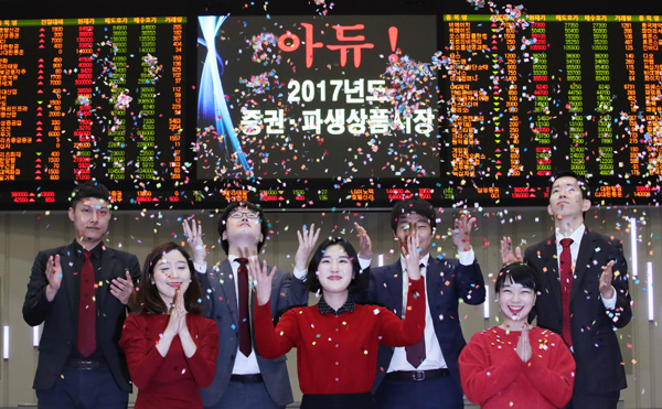 2017 증권ㆍ파생상품시장 폐장일인 28일 오후 서울 여의도 한국거래소 홍보관에서 직원들이 색종이를 뿌리며 한 해를 마무리하고 있다. 이날 코스피 지수는 전날 대비 30.82포인트(1.26%) 오른 2,467.49로, 코스닥 지수는 6.47포인트(0.82%) 오른 798.42로 장을 마감했다./연합뉴스