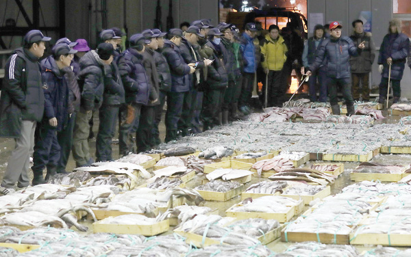 2일 오전 인천시 중구 인천수협공판장에서 열린 새해 첫 경매에서 경매사들과 상인들이 수산물을 살펴보고 있다. /연합뉴스