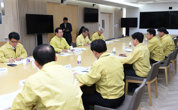 김영록 농림축산식품부 장관이 4일 오후 경기도 북부청사 상황실을 방문, 김진흥 도 행정2부지사를 비롯한 관계자들과 ‘AI 방역추진상황 대책회의’를 열고 있다./경기도 제공