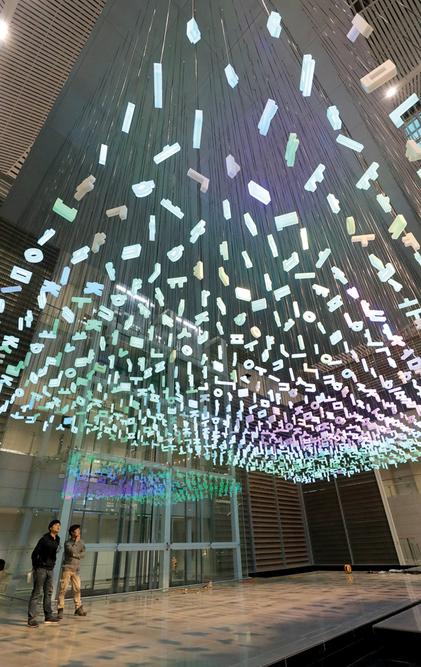 개장을 10일 남겨둔 인천공항 제2여객터미널에서 8일 오후 작업자들이 입국장에 한글자모를 이용한 조형미술작품을 설치하고 있다. /연합뉴스