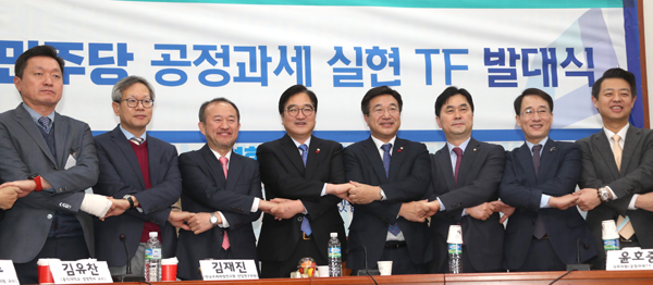더불어민주당 우원식 원내대표 등 참석자들이 9일 국회에서 열린 공정과세 실현 TF발대식에서 손을 잡고 공정과세실현을 다짐하고 있다./연합뉴스