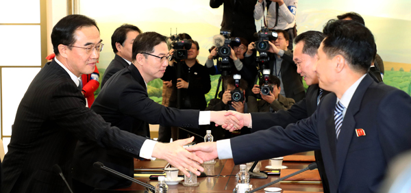 조명균 통일부 장관을 비롯한 남측 대표단이 9일 오전 남북 고위급회담이 열리는 판문점 남측 평화의 집에서 리선권 조국평화통일위원회 위원장을 비롯한 북측 대표단과 전체 회의 시작에 앞서 악수를 하고 있다. /사진공동취재단