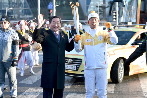 유정복 인천시장이 10일 송도 코스트코 앞에서 평창동계올림픽대회 인천관내 성화 봉송에 앞서 강인덕 인천체육회상임부회장과 함께 손을 흔들고 있다. /인천시 제공