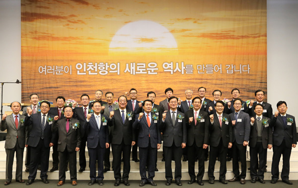인천항만공사(IPA)가 17일 ‘2018 인천항 항만가족 신년인사회’를 개최, 참석자들이 ‘물류와 해양관광의 글로벌 플랫폼’ 비전을 향한 의지를 모아 파이팅을 외치고 있다. /인천항만공사 제공