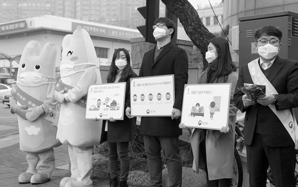 수도권 미세먼지 비상저감조치가 시행된 17일 오전 수도권대기환경청 관계자들이 안산시 안산시청 앞에서 시민들의 차량 2부제 참여와 마스크 착용을 독려하기 위한 캠페인을 열고 있다. /수도권대기환경청 제공