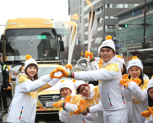 18일 오후 고양 구간 일산에서 열린 2018 평창동계올림픽 성화봉송 행사에서 가수 산다라박(왼쪽)이 전 주자인 김예지와 손 터치하고 있다. /연합뉴스