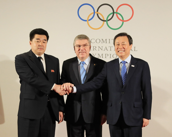 도종환 문화체육관광부 장관(오른쪽 부터), 토마스 바흐 국제올림픽위원회(IOC) 위원장, 김일국 북한 체육상이 19일(현지시간) 스위스 로잔의 IOC 본부에서 남북한 올림픽 참가회의를 시작하기 전 손을 맞잡고 있다./연합뉴스