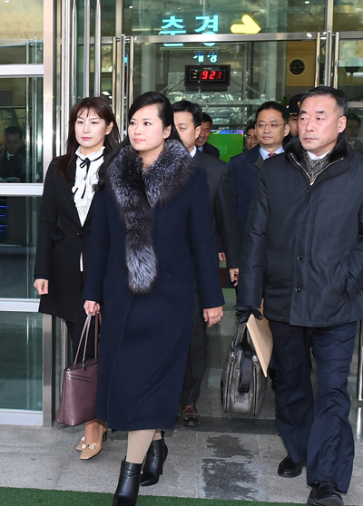 현송월 삼지연 관현악단 단장 등 북한 평창 동계올림픽 예술단 공연을 위한 사전점검단이 21일 오전 남북출입사무소를 나서고 있다. /통일부 제공