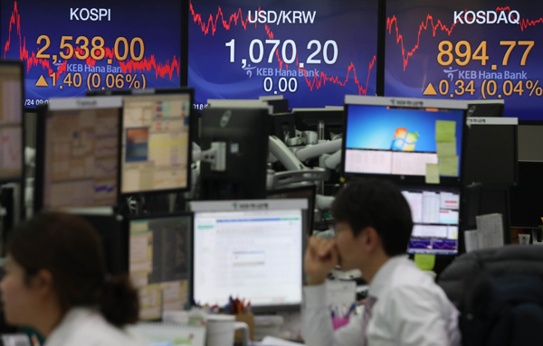 코스피가 1.40포인트 오른 2,538.00으로 장을 마감한 24일 오후 서울 중구 을지로 KEB하나은행 본점 딜링룸에서 딜러들이 업무를 보고 있다./연합뉴스