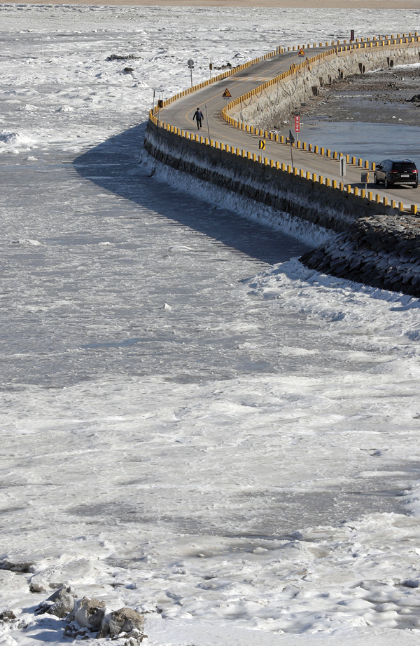 한낮에도 영하 10도를 밑도는 강추위가 계속된 24일 오전 인천시 중구 영종도와 잠진도를 잇는 연륙도로 주위 바다가 얼어붙어 있다. /연합뉴스