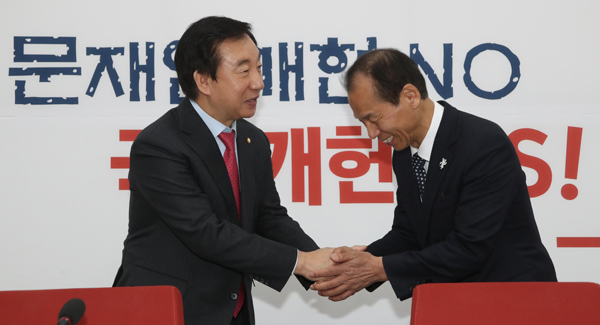 자유한국당 김성태 원내대표가 25일 국회 원내대표실을 방문한 최문순 강원도지사와 인사하고 있다. 최 지사는 김 원내대표에게 “평화올림픽을 위해 올림픽에 꼭 방문해 주세요”라고 인사했다./연합뉴스