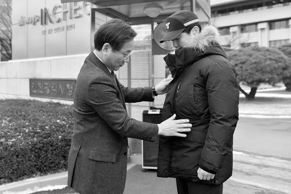 유정복 인천시장이 최근 유례없는 한파 속에 31일 시청 정문에서 청원경찰에게 방한복을 지원하고 있다. /인천시 제공
