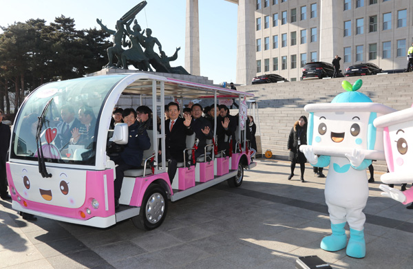 정세균 국회의장이 1일 국회 본관 앞에서 참석자들과 함께 새로 교체한 국회참관셔틀 전기차를 타고 행사장으로 이동하고 있다./연합뉴스