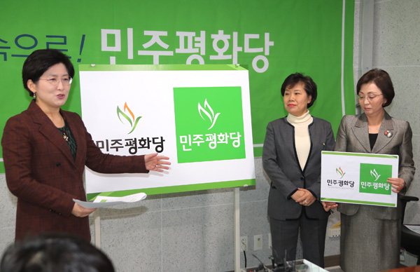민주평화당 박주현 홍보위원장이 4일 오전 국회 의원회관에서 열린 기자간담회에서 당명의 의미와 공식 로고를 발표하고 있다. 왼쪽부터 박주현 홍보위원장, 조배숙 창준위원장, 장정숙 대변인./연합뉴스