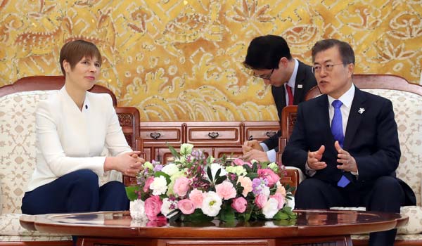 문재인 대통령이 6일 오후 청와대에서 평창동계올림픽을 계기로 방한한 케르스티 칼유라이드 에스토니아 대통령을 만나 정상회담을 하고 있다. 지난 2016년 47세의 나이로 취임한 칼유라이드 대통령은 에스토니아 최초의 여성대통령이자, 역대 최연소 대통령이다. /연합뉴스