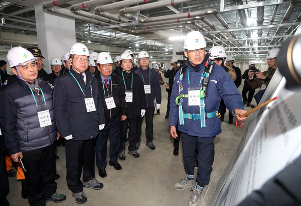 8일 오후 광명역파크자이아파트 건설현장에서 열린 ‘2018년 국가안전대진단 현장점검 및 간담회’에서 김부겸 행정안전부 장관, 이재율 경기도 행정1부지사, 백재현 국회의원(광명시갑) 등 주요 참석자들이 건설현장의 무용접 배관 시설을 살펴보며 브리핑을 받고 있다./경기도 제공
