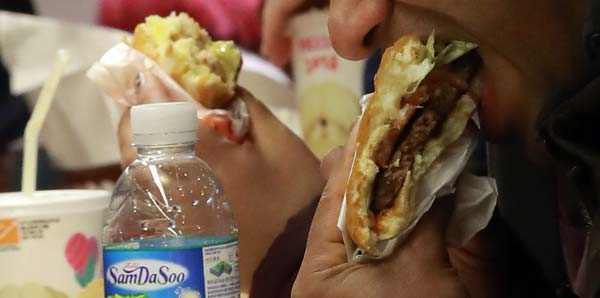 최저임금 상승, 원자재 가격 상승 등의 여파로 햄버거, 커피 등의 외식물가가 치솟고 있어 서민 경기에 적신호가 켜졌다. 사진은 18일 서울 용산구 서울역의 한 패스트푸드점에서 한 외국인이 햄버거를 먹고 있다./연합뉴스