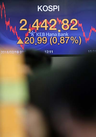 19일 오후 서울 KEB하나은행 본점 딜링룸 상황판에 코스피 마감지수가 나타나고 있다. 이날 코스피는 전 거래일 대비 20.99 포인트(0.87%) 오른 2,442.82로 마감했다. /연합뉴스