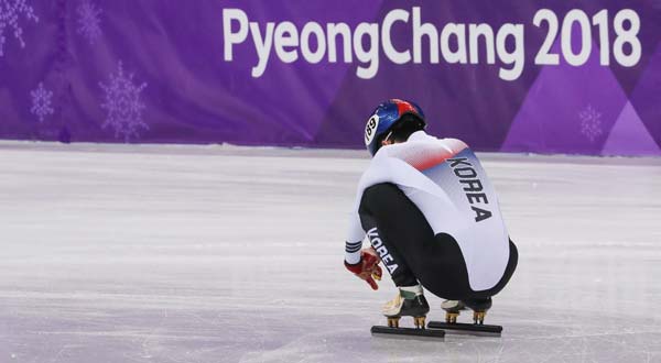 22일 강릉 아이스아레나에서 열린 2018 평창동계올림픽 쇼트트랙 남자 5,000m 계주 결승에서 넘어진 한국의 임효준이 경기가 끝난 뒤 아쉬워하고 있다./연합뉴스